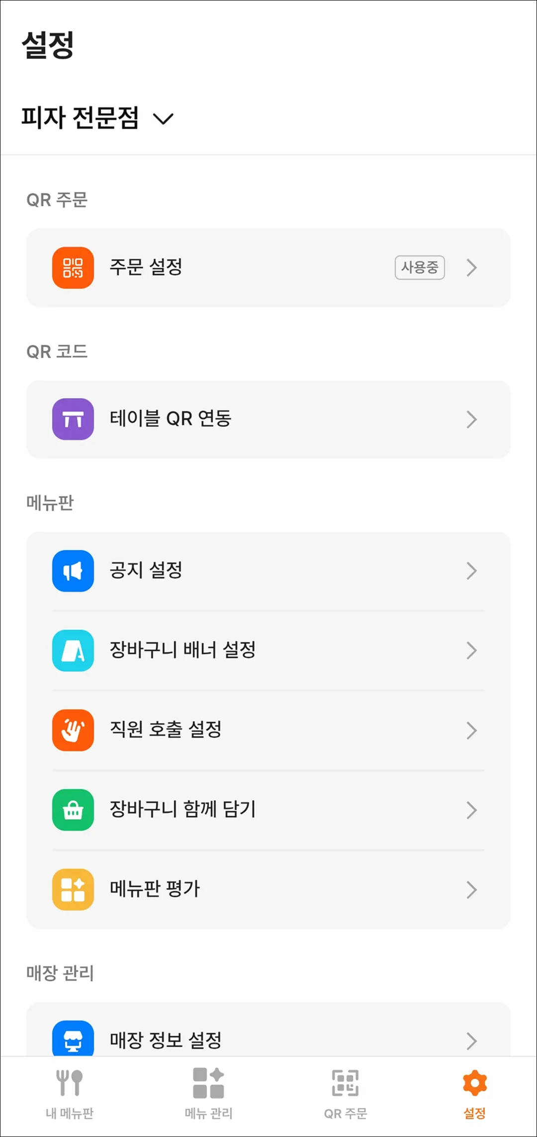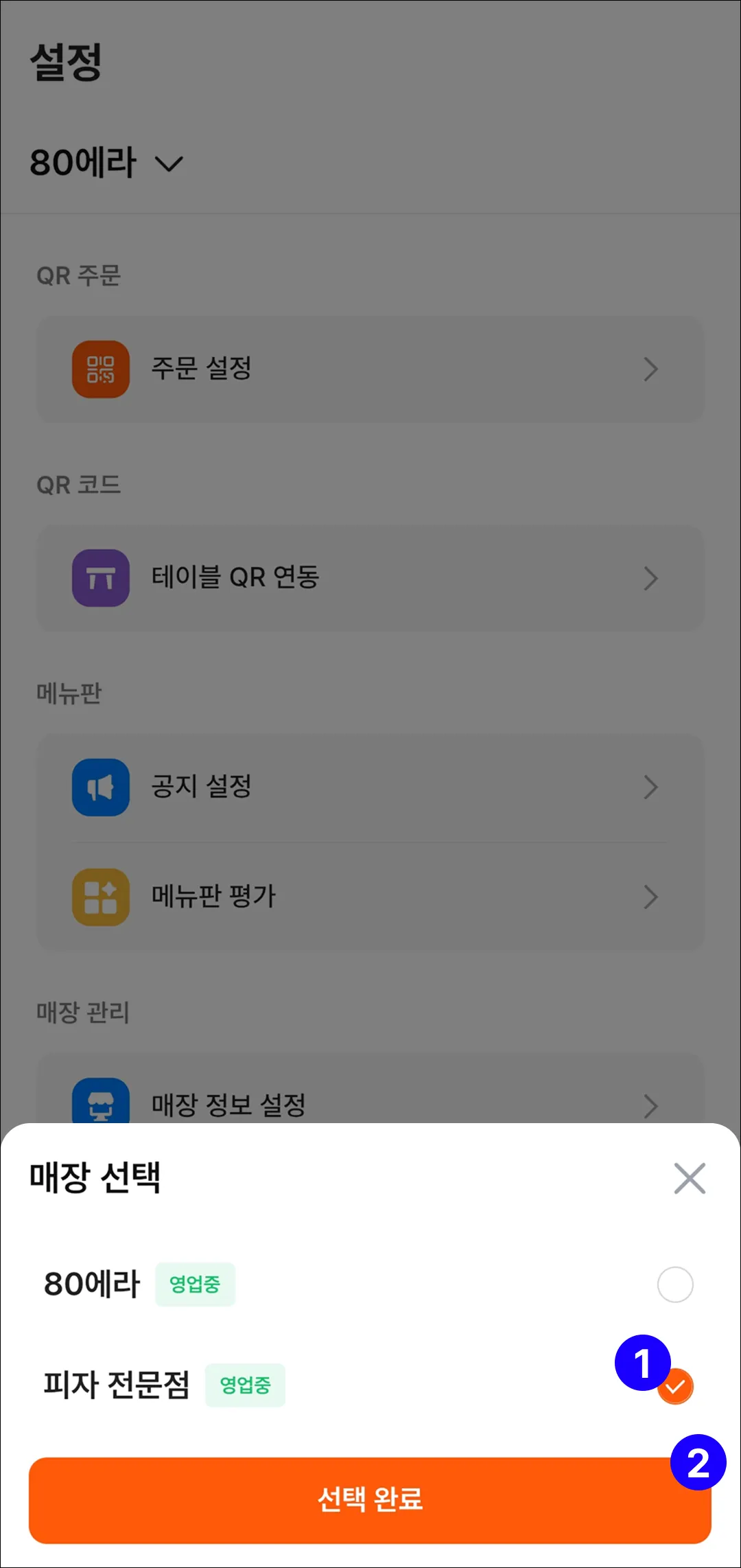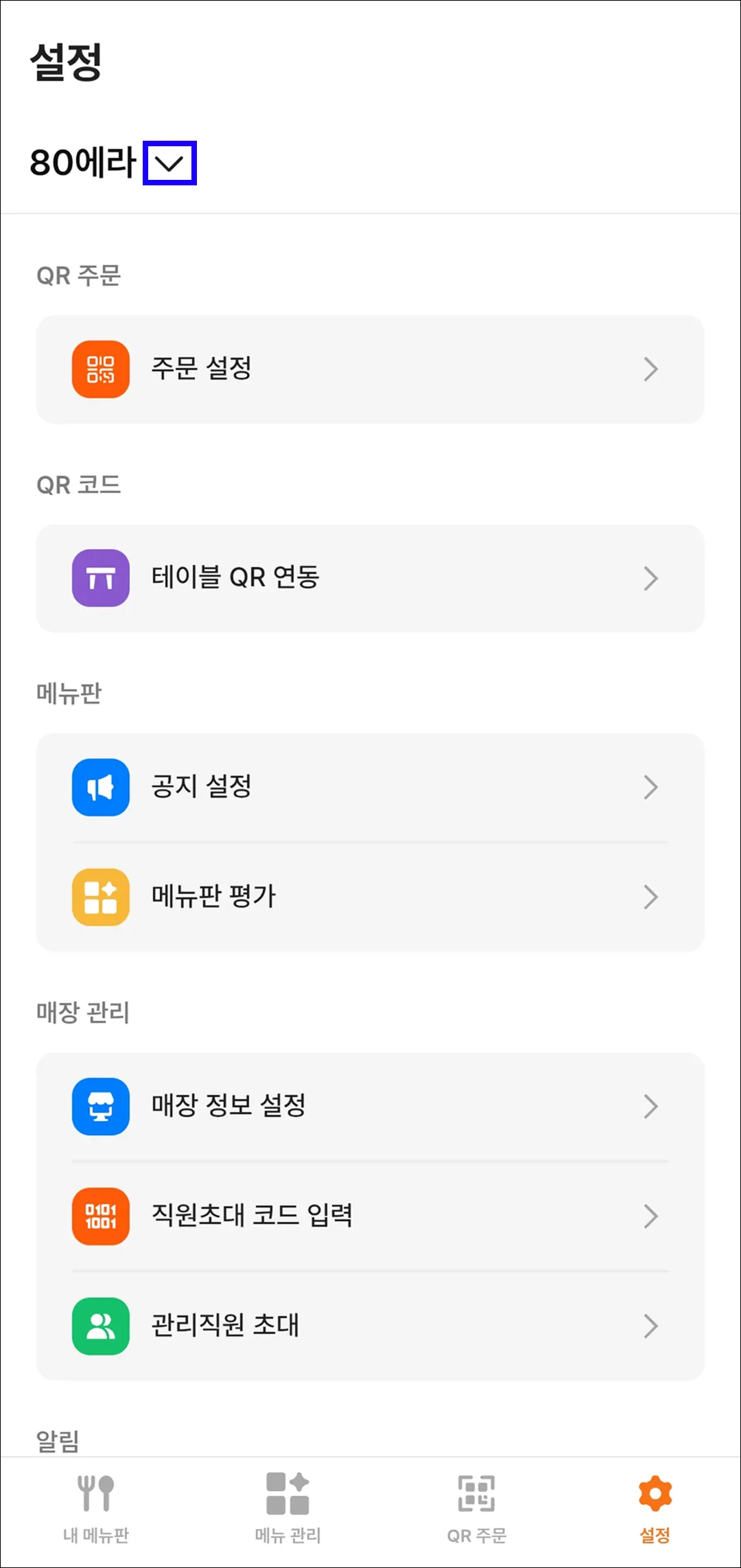 [설정] 내 맨 위, 매장 이름 옆에 있는 [∨] 버튼을 클릭하세요.