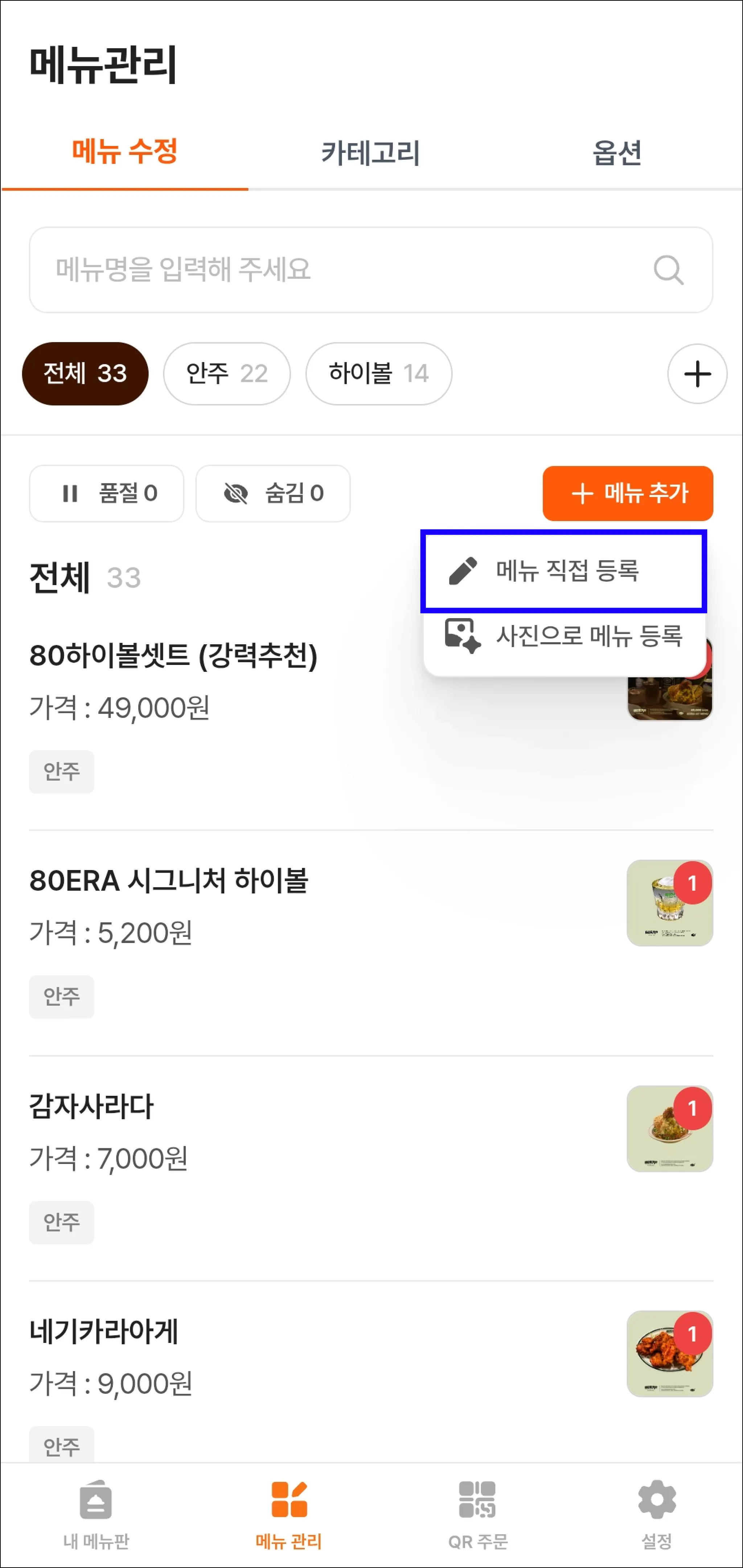 [메뉴 관리]에서 오른쪽 상단 ‘메뉴 추가’ 버튼을 누르고, ‘메뉴 직접 등록’을 선택하세요.