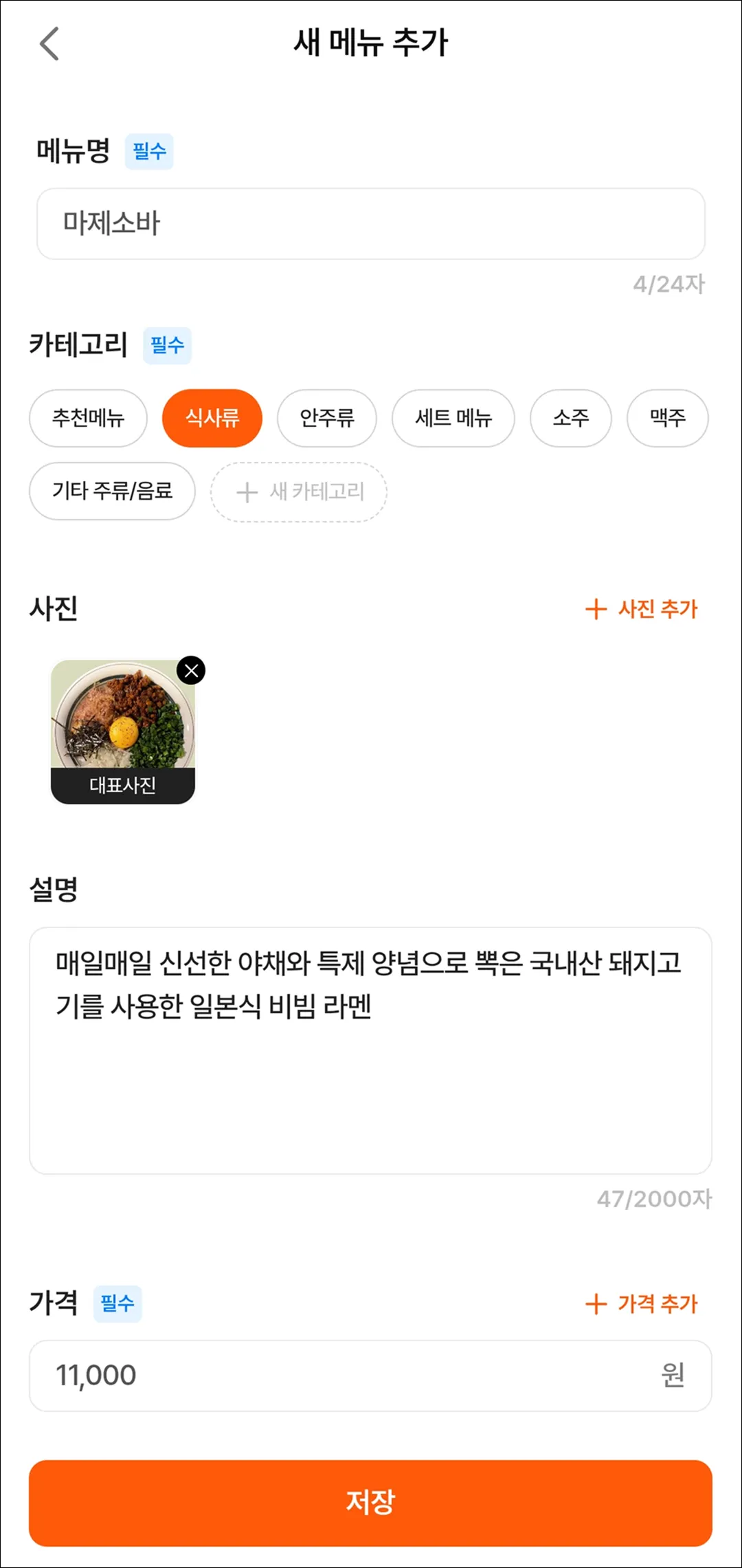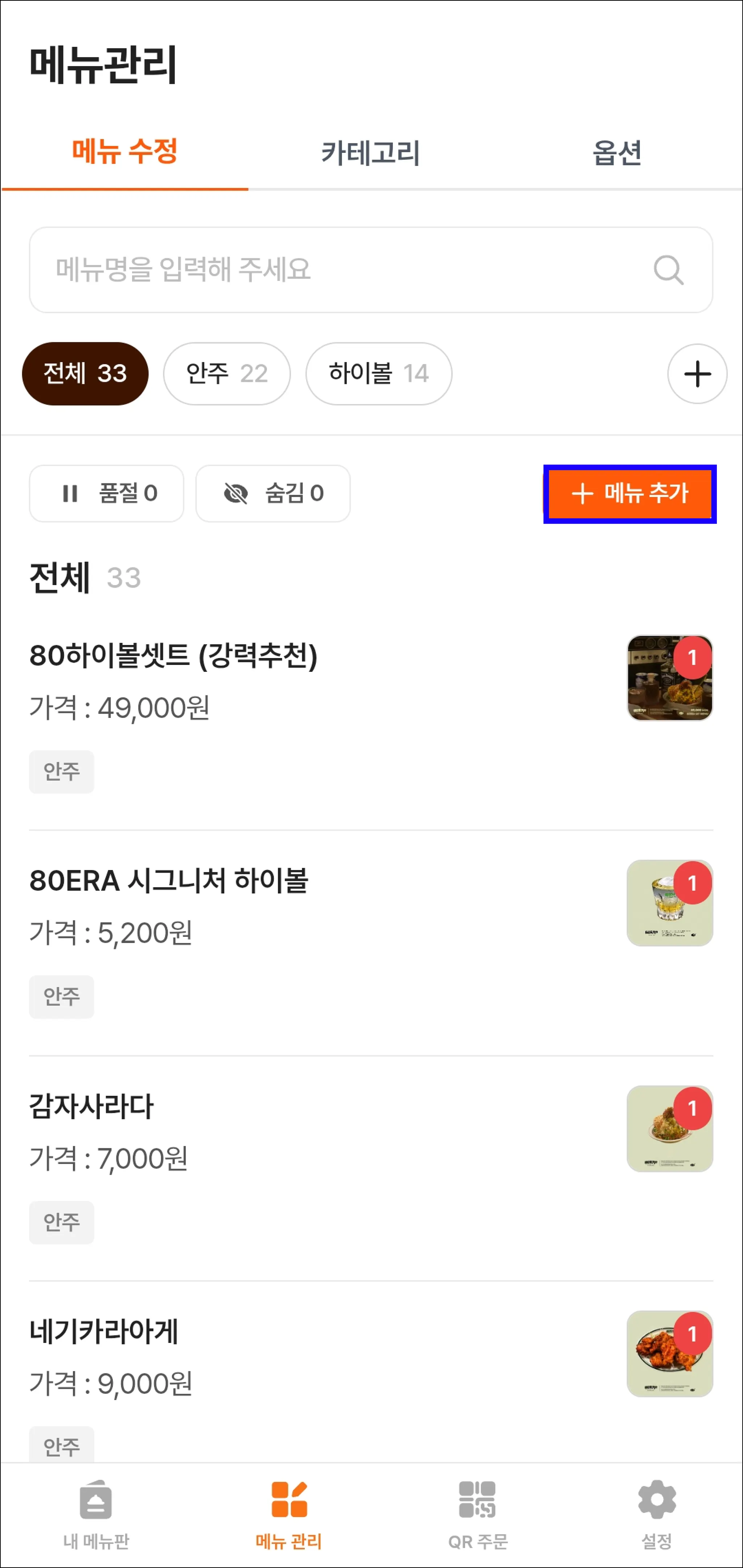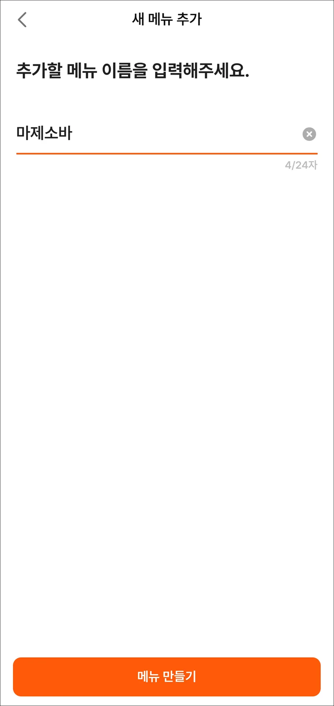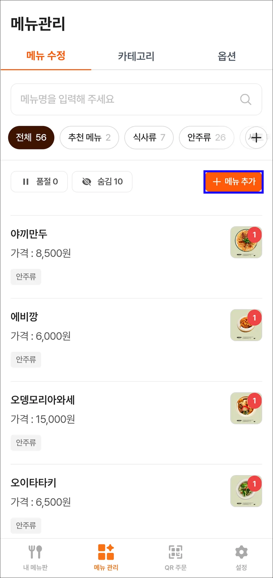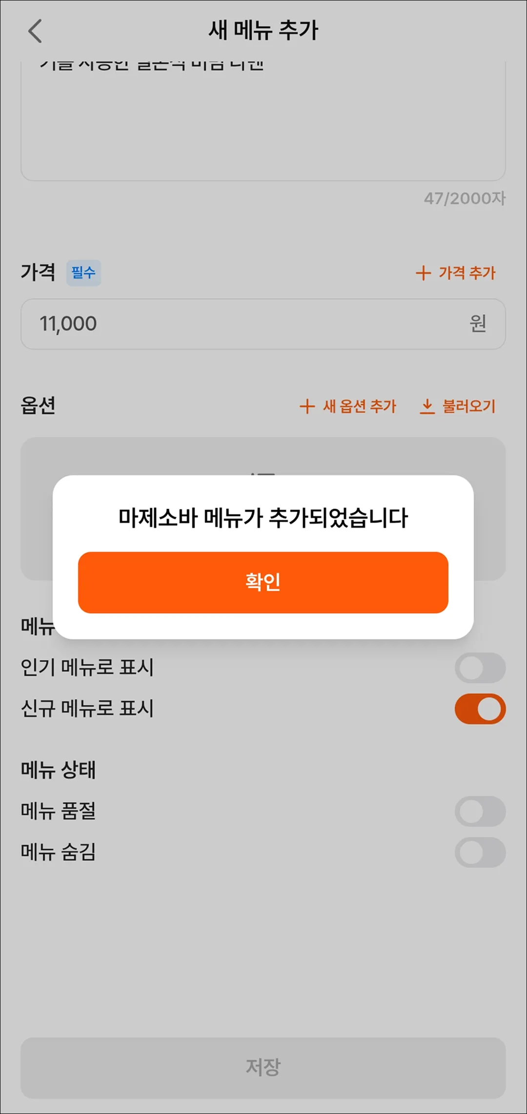 저장 버튼을 누르면 메뉴가 메뉴판에 추가됩니다.
