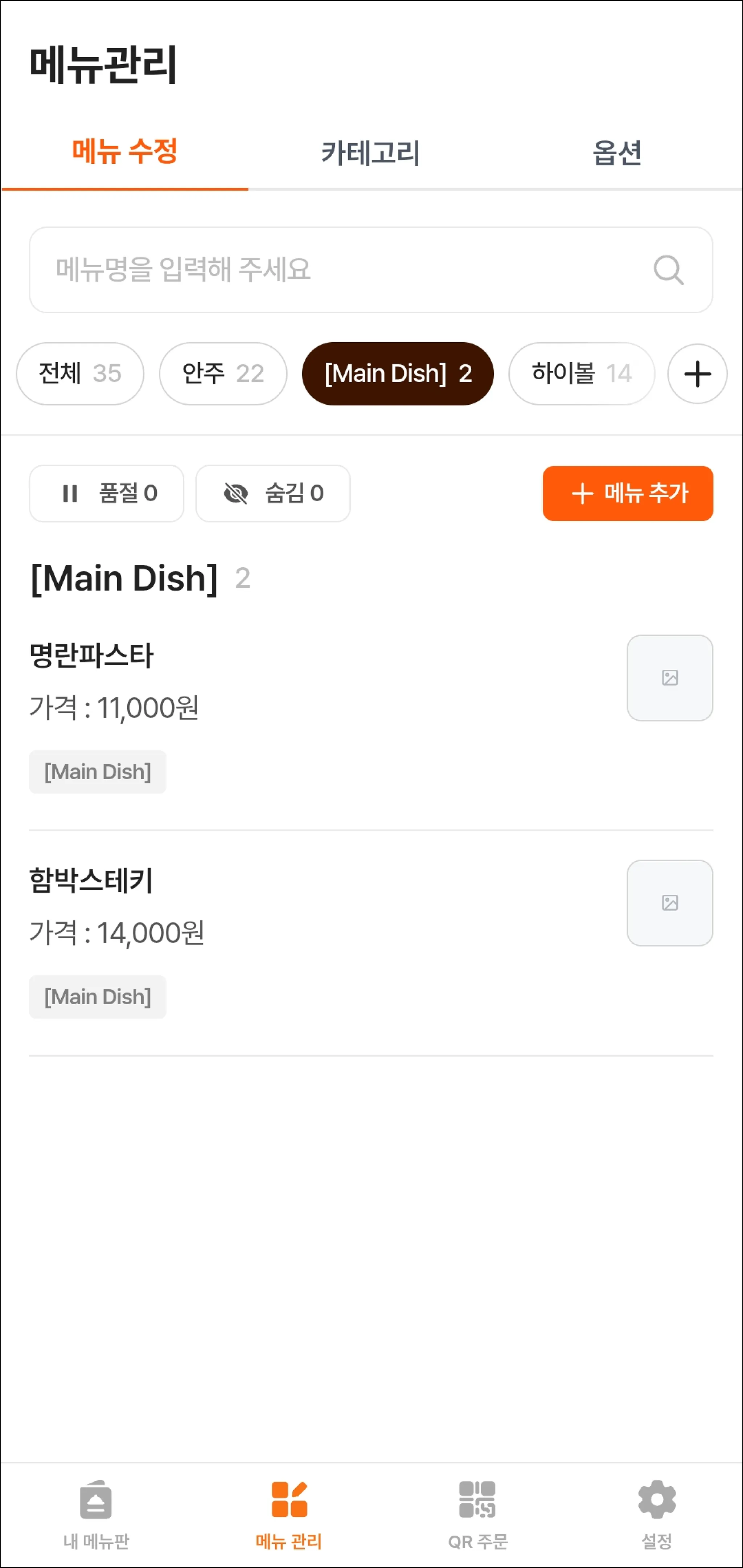 카테고리: 메뉴를 종류별로 구분할 수 있어요. (ex. 커피/스무디/디저트, 식사/안주/주류 등)
