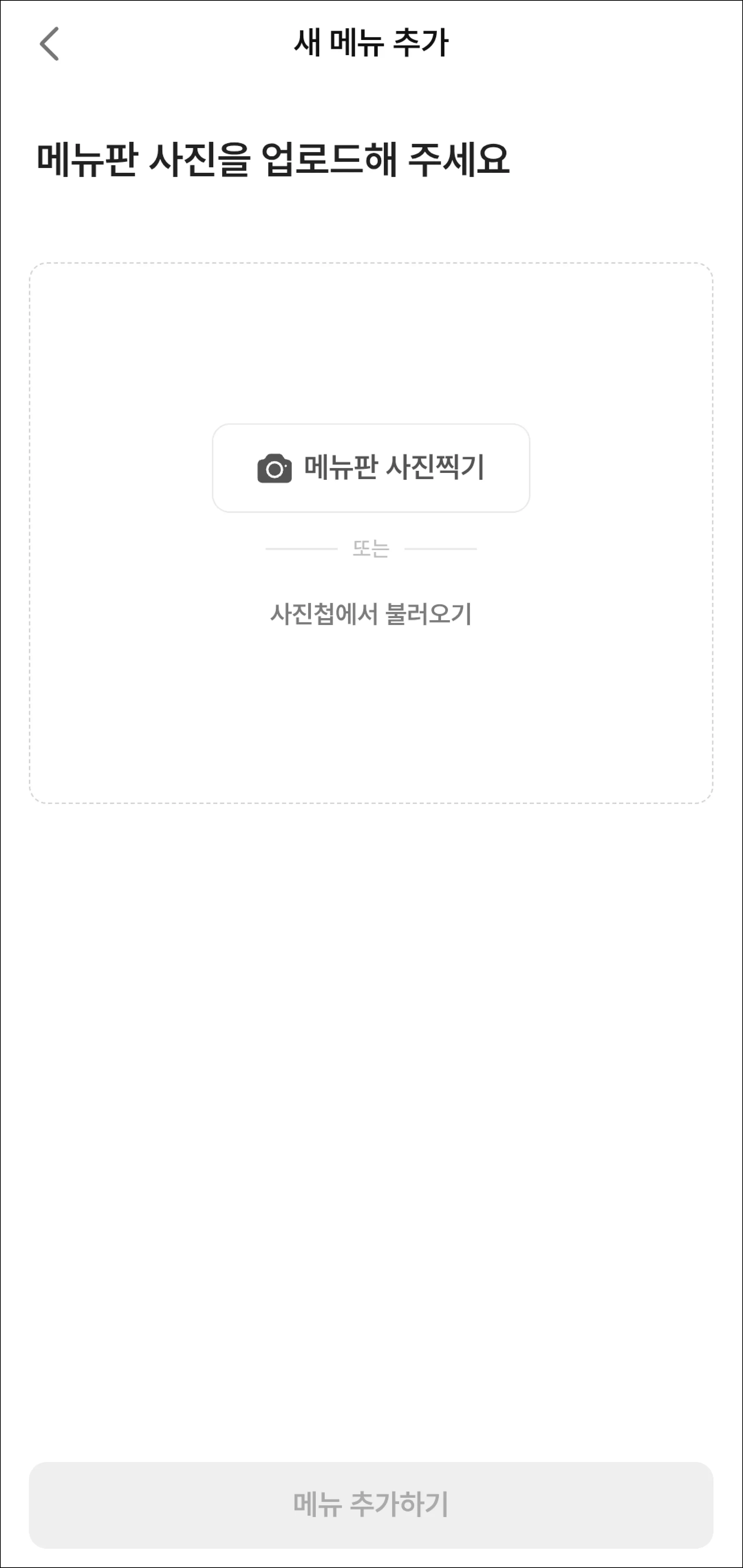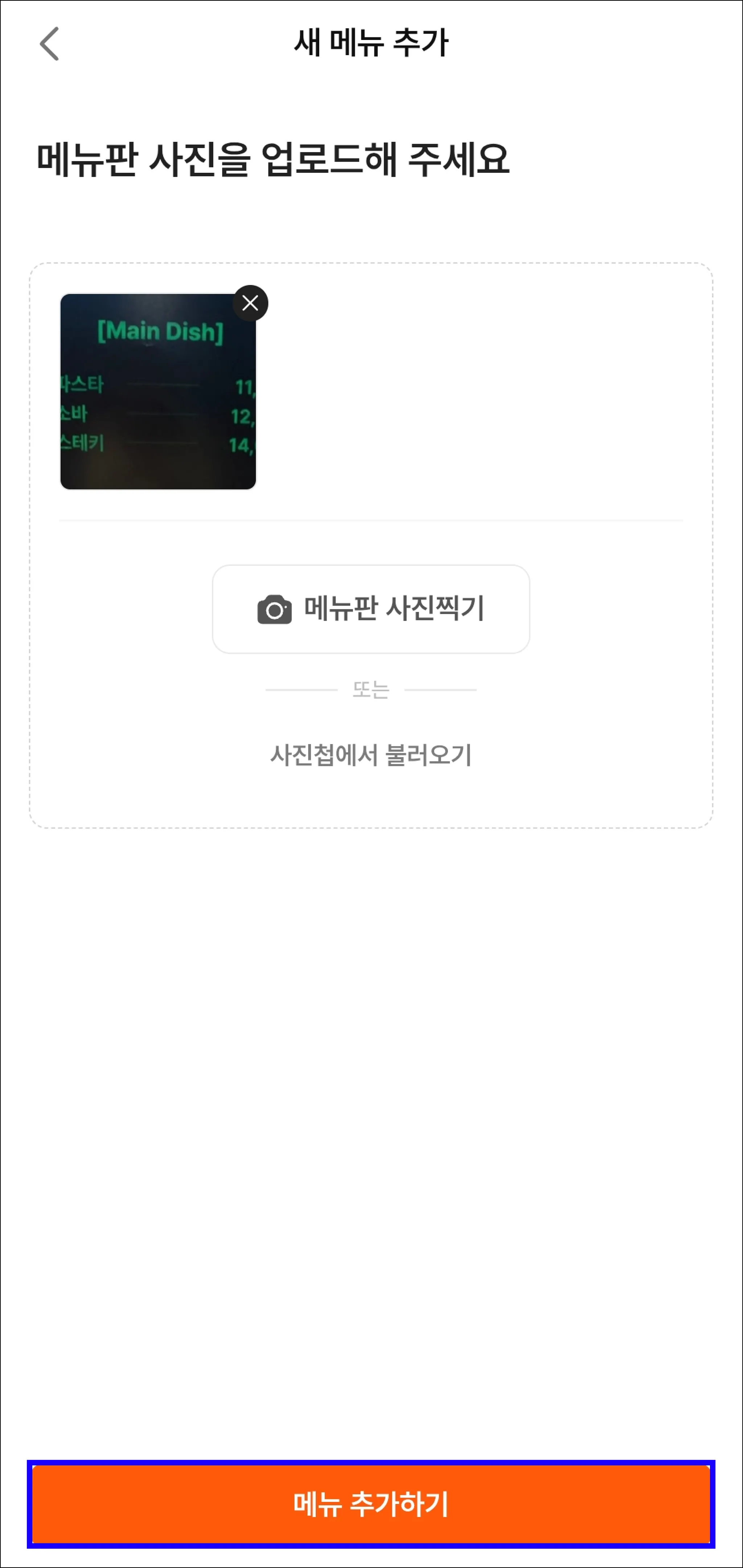메뉴판 사진을 업로드하고 ‘메뉴 추가하기’ 버튼을 누르세요.