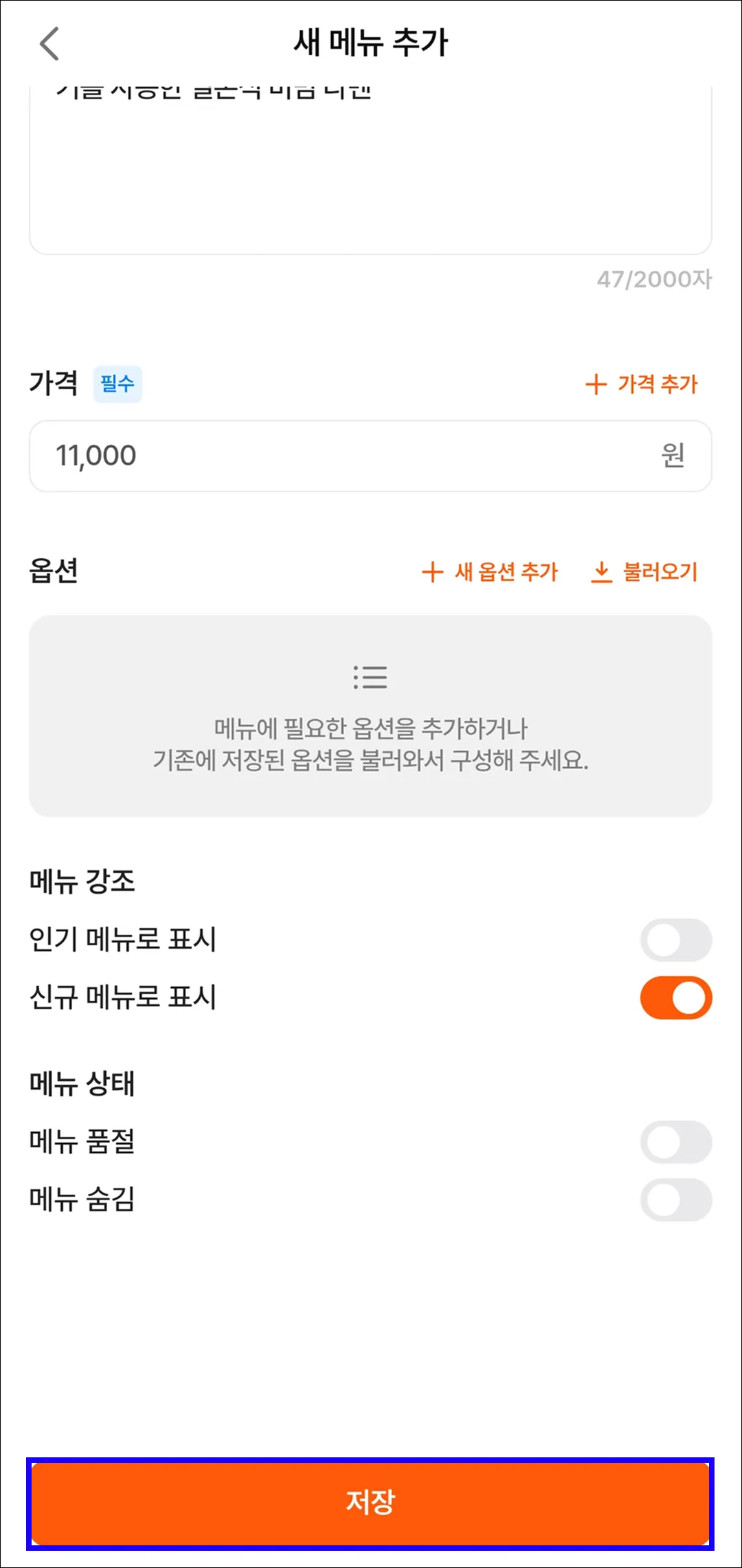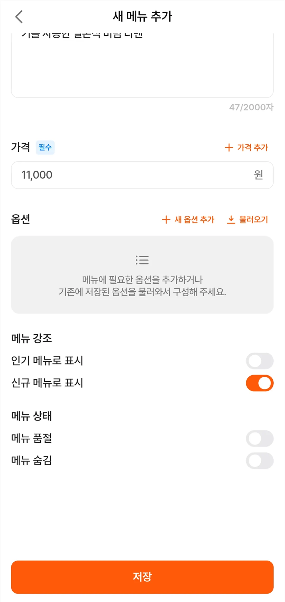 가격: 한 메뉴에 여러 가지 가격 옵션이 있다면 각각 입력할 수 있어요. (ex. 기본/곱빼기, 1인분/2인분 등)