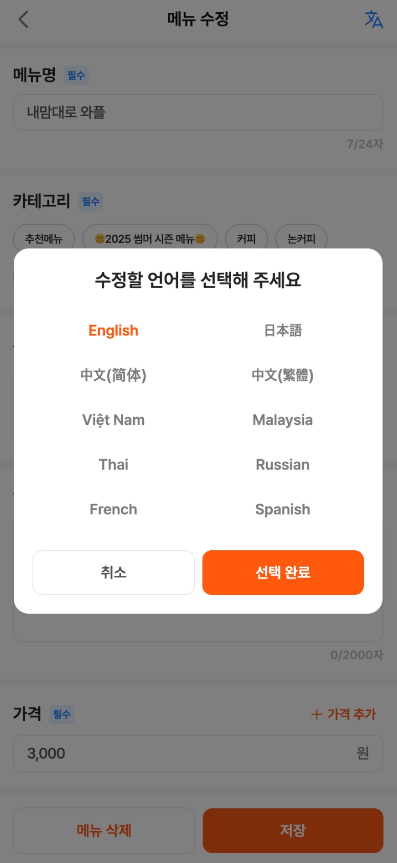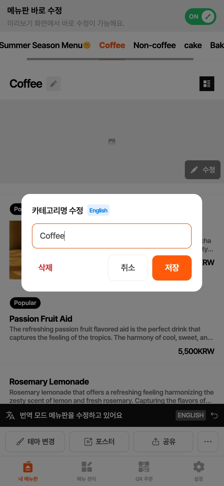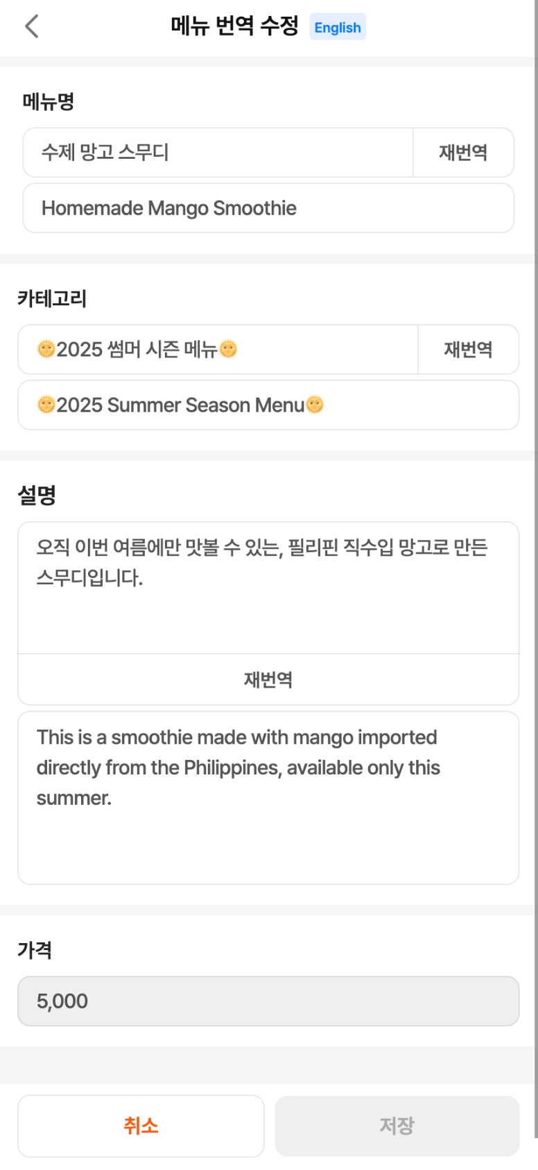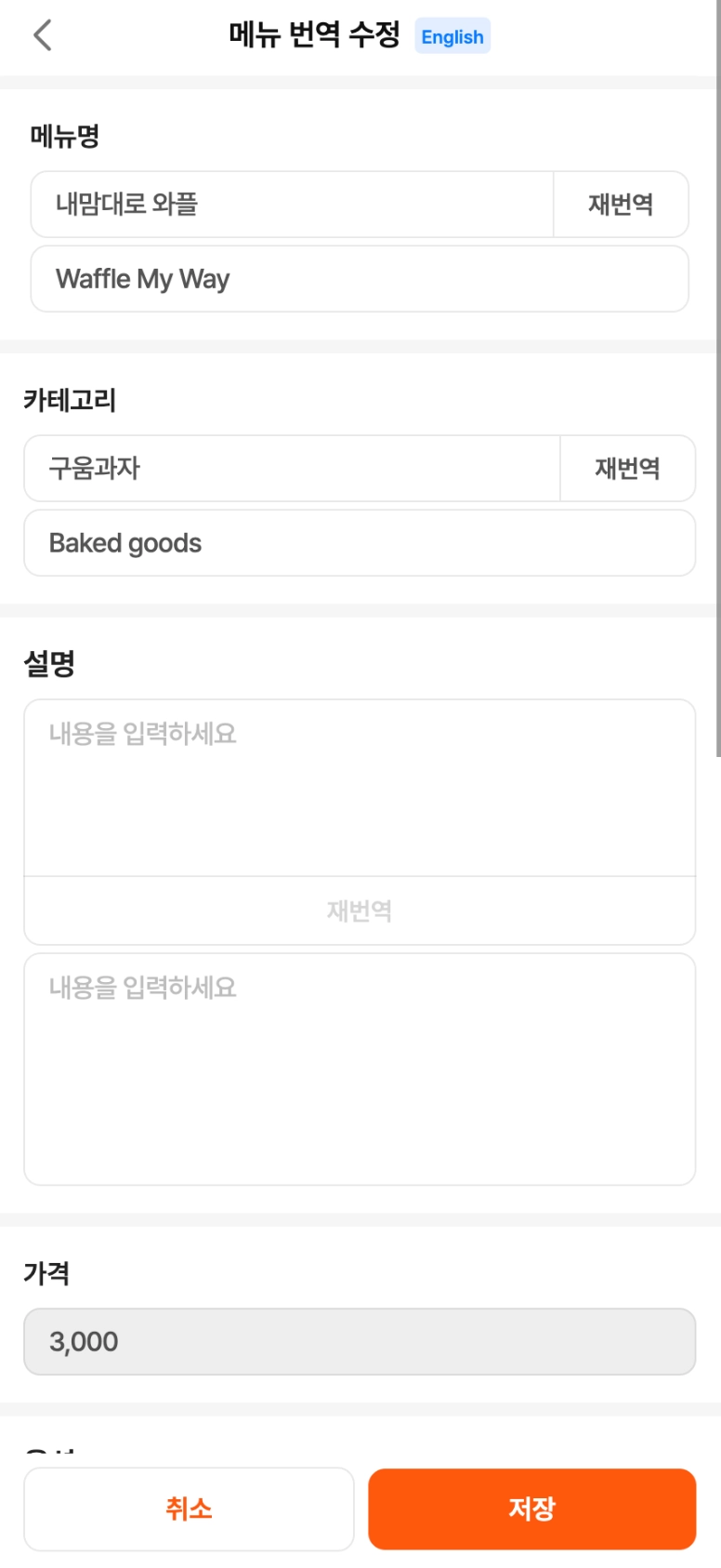 메뉴명, 카테고리, 설명, 가격명, 옵션 등 번역된 언어를 수정할 수 있어요.