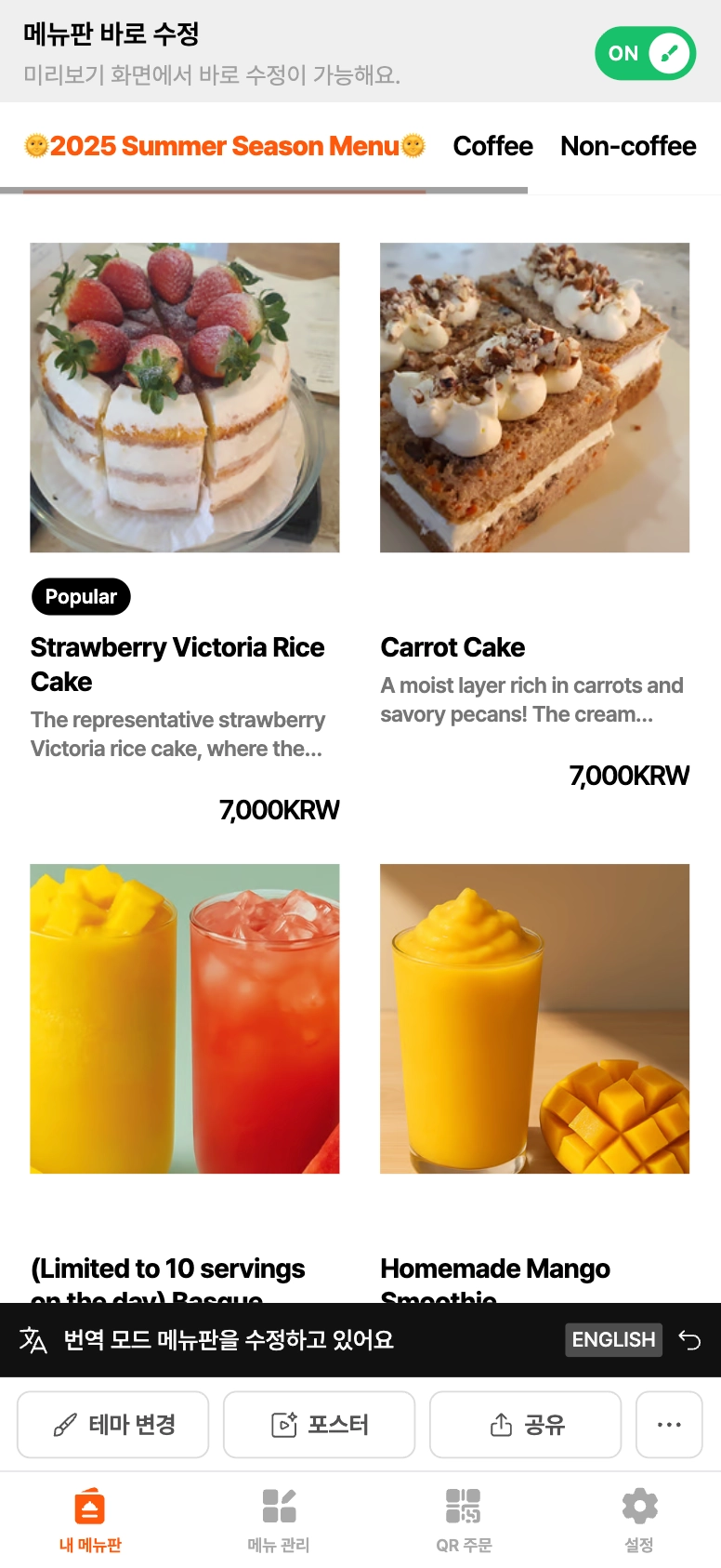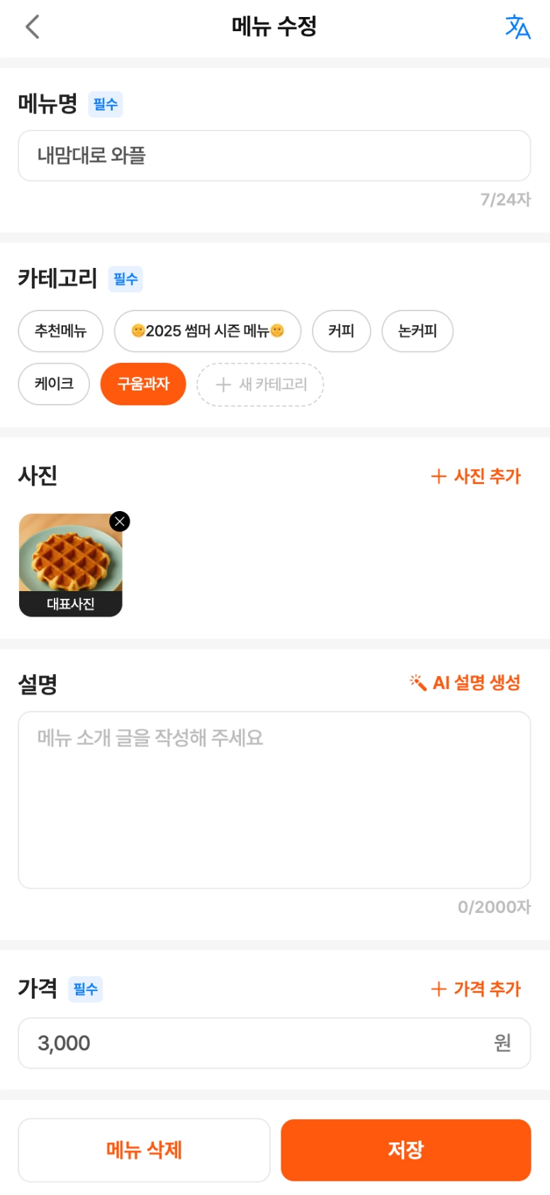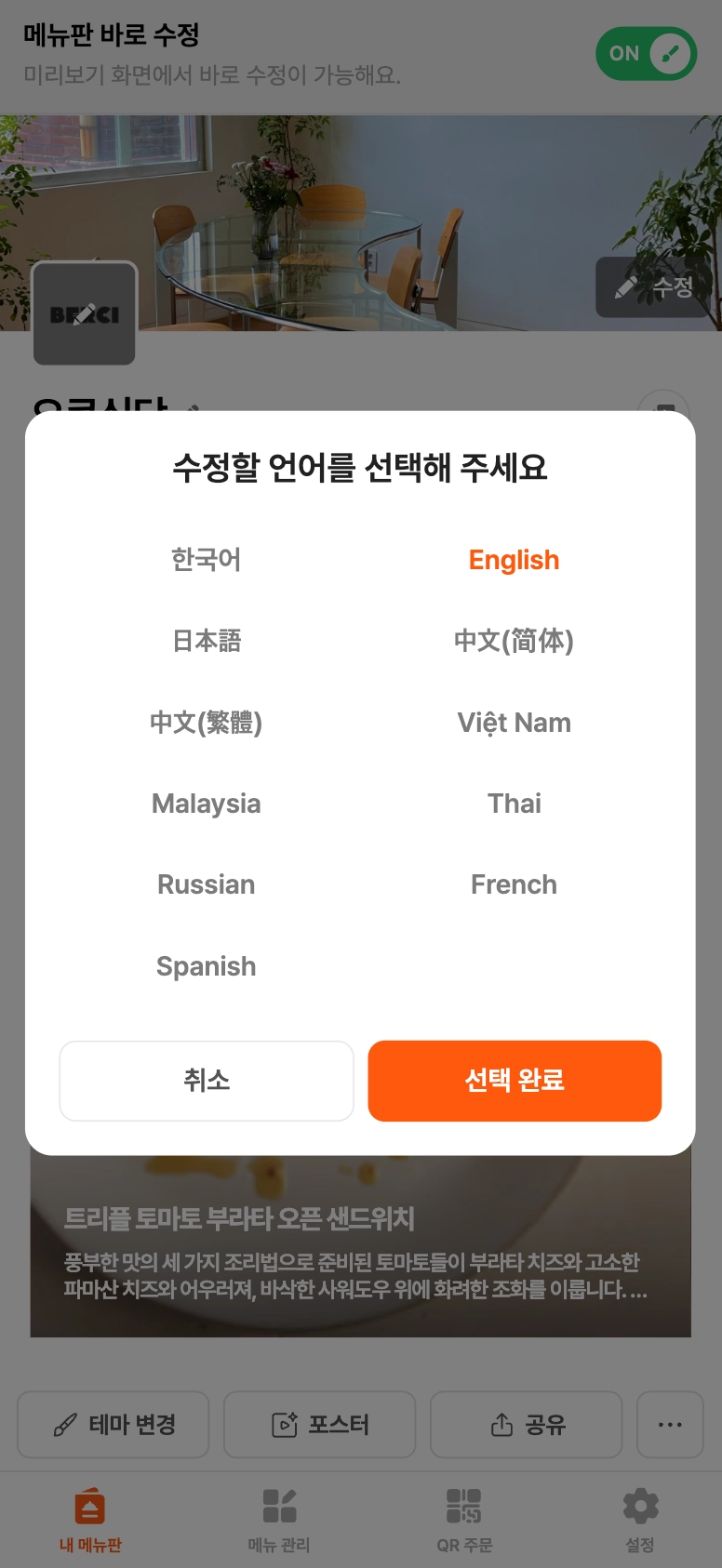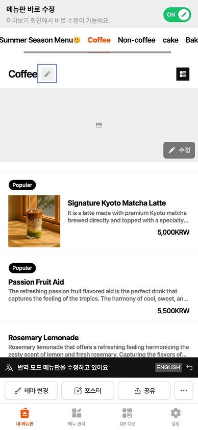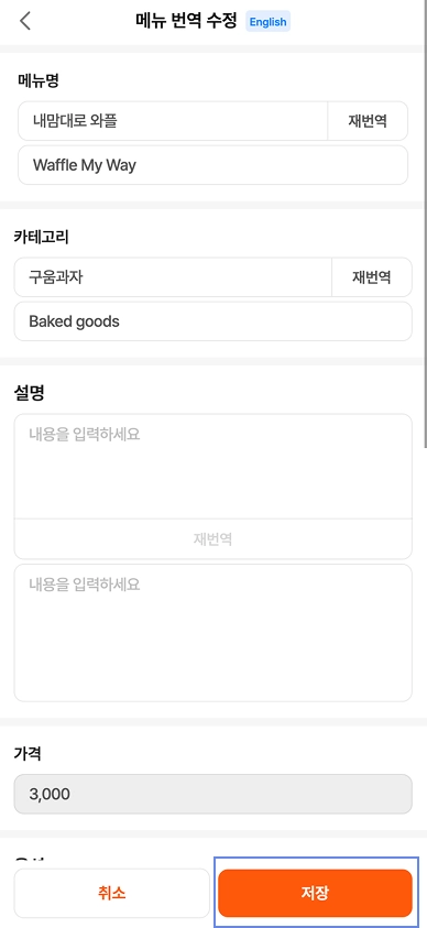 메뉴명, 카테고리, 설명, 가격명, 옵션 등 번역된 언어를 수정할 수 있어요.