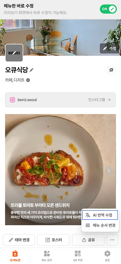 [내 메뉴판]의 편집모드에서 오른쪽 아래 점 세 개(…) 아이콘을 누르고 AI 번역 수정 을 클릭합니다.