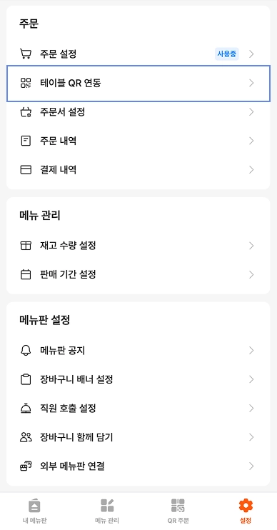 [설정] 메뉴에서 [테이블 QR 연동]을 클릭하세요.