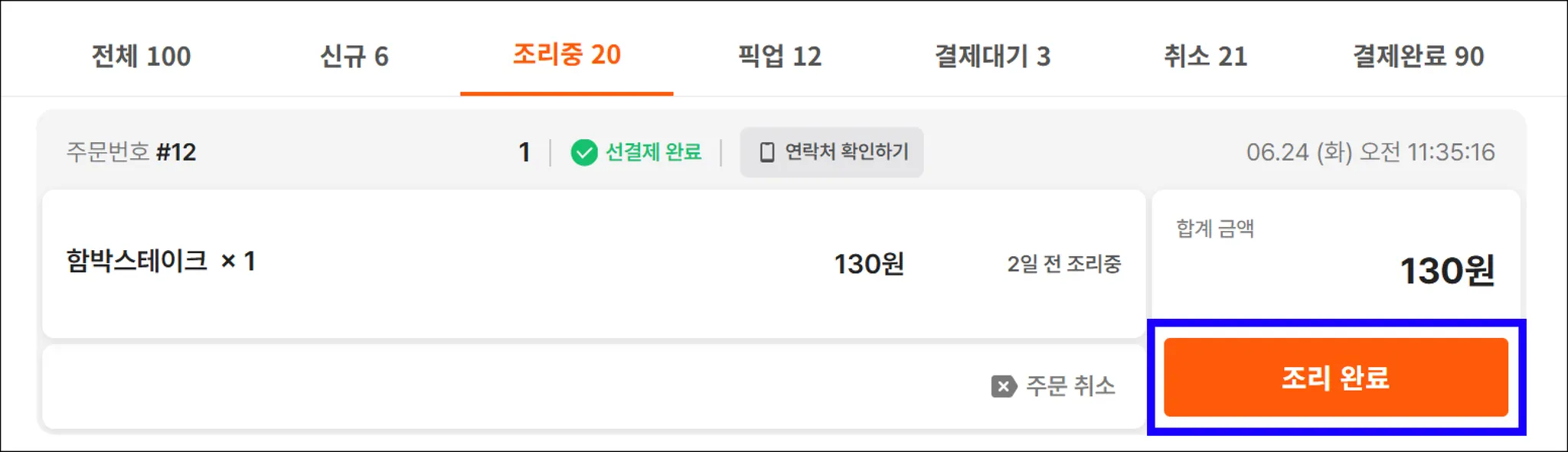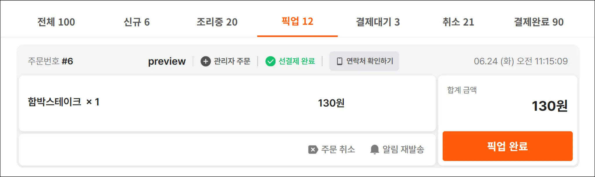 주문 단계가 [신규] - [조리중] - [픽업] - [결제대기] 일 경우