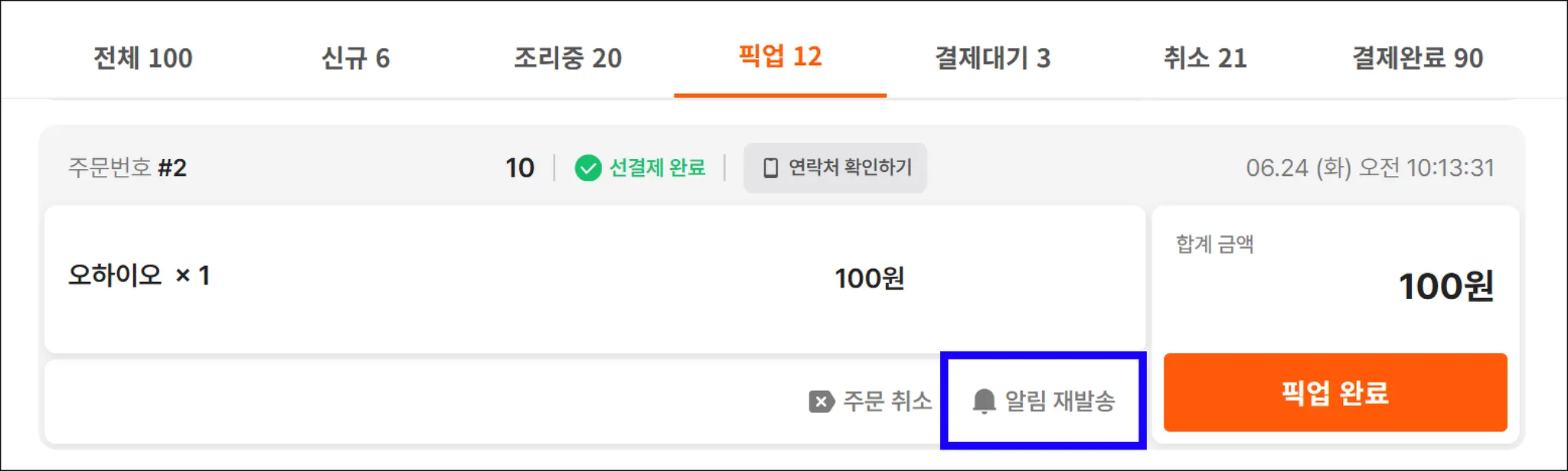 [픽업]에서 에서 ‘알림 재발송’을 누르면 알림톡이 다시 발송됩니다.