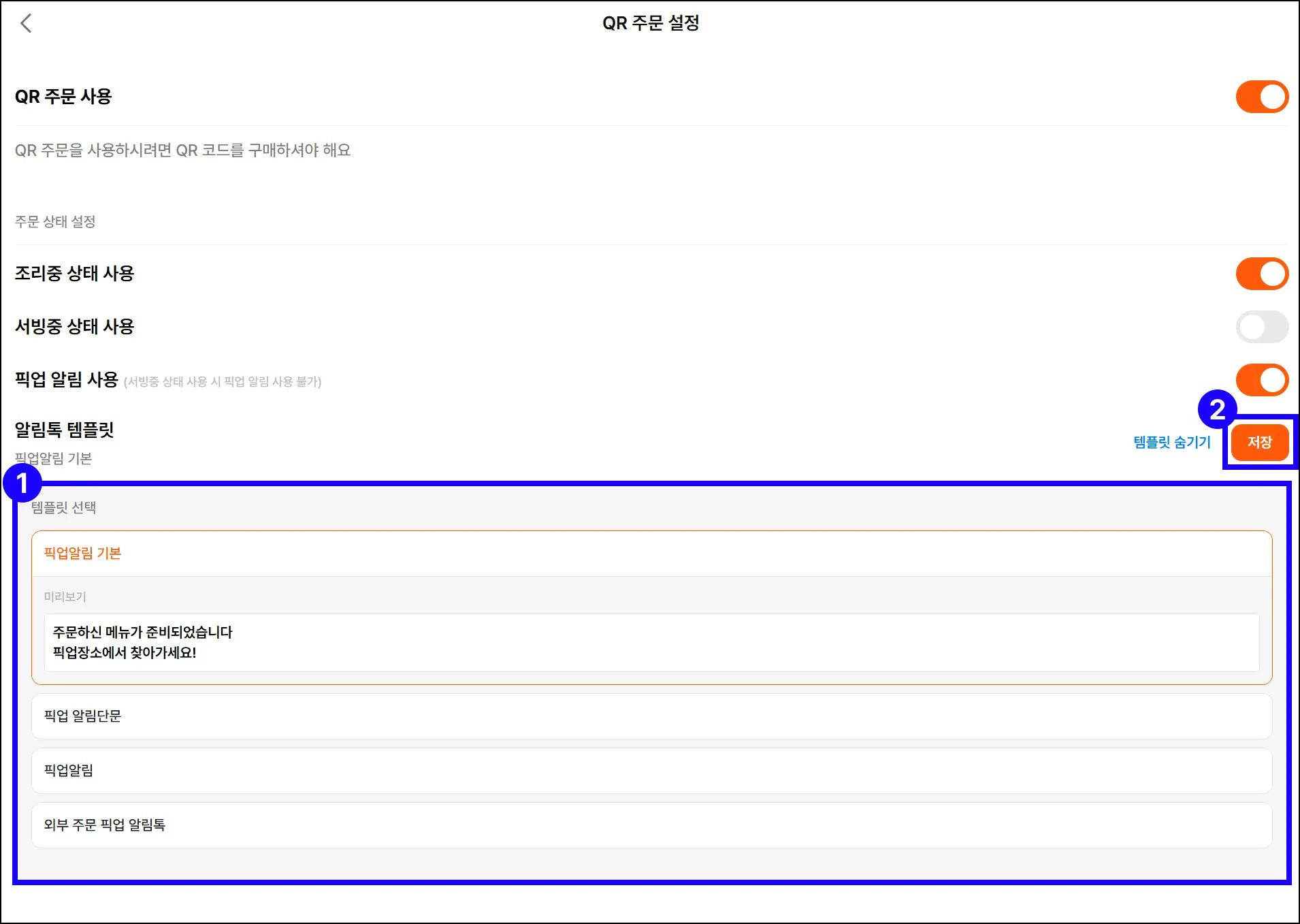 ‘템플릿 선택’에서 원하는 픽업 알림 템플릿을 선택하고, [저장]을 눌러 주세요.