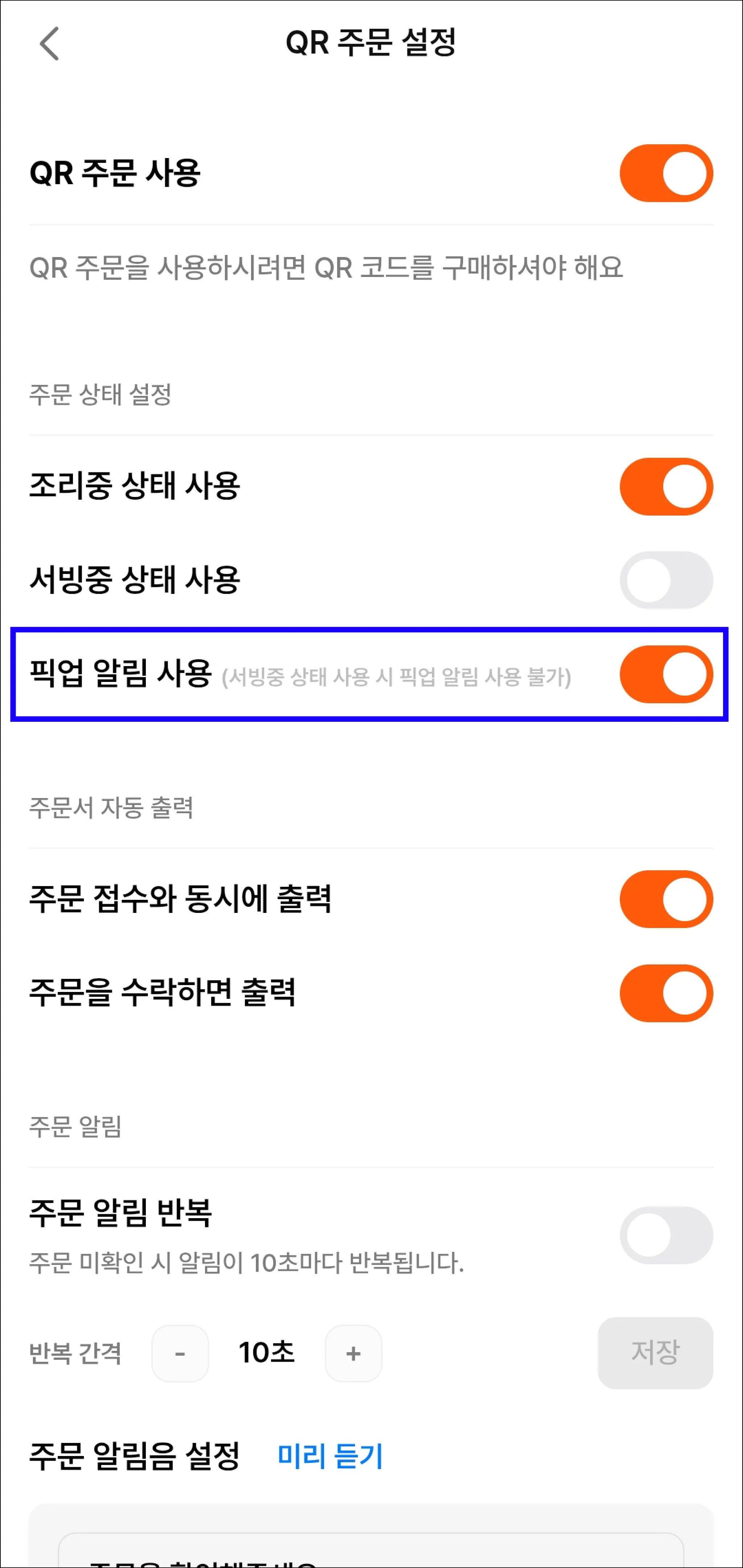* ‘픽업 알림’을 사용하면 ‘서빙중 상태’를 사용할 수 없습니다.