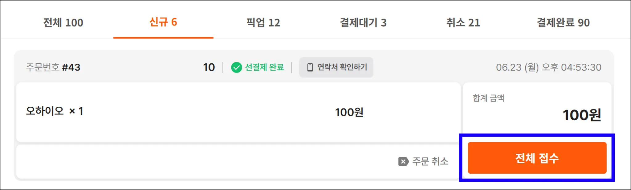 [신규]에서 [전체 접수] 버튼을 누르면 주문자에게 알림톡이 발송됩니다.