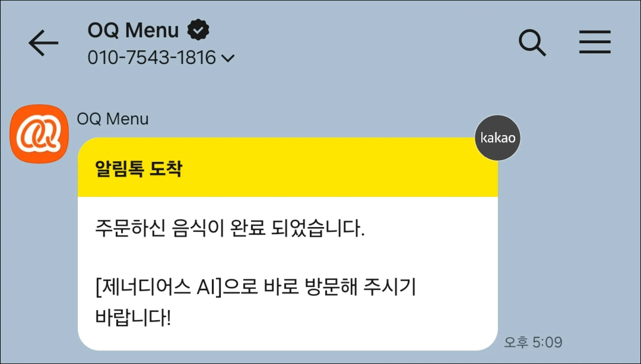 메뉴가 준비되면 고객이 주문 시 입력한 전화번호로 카카오 알림톡을 발송할 수 있습니다. 메뉴 픽업 알림 또는 대기자 입장 안내 용도로 활용할 수 있어요.