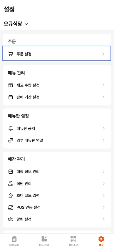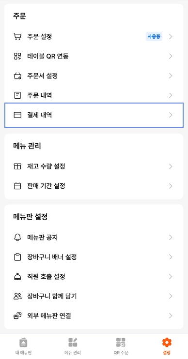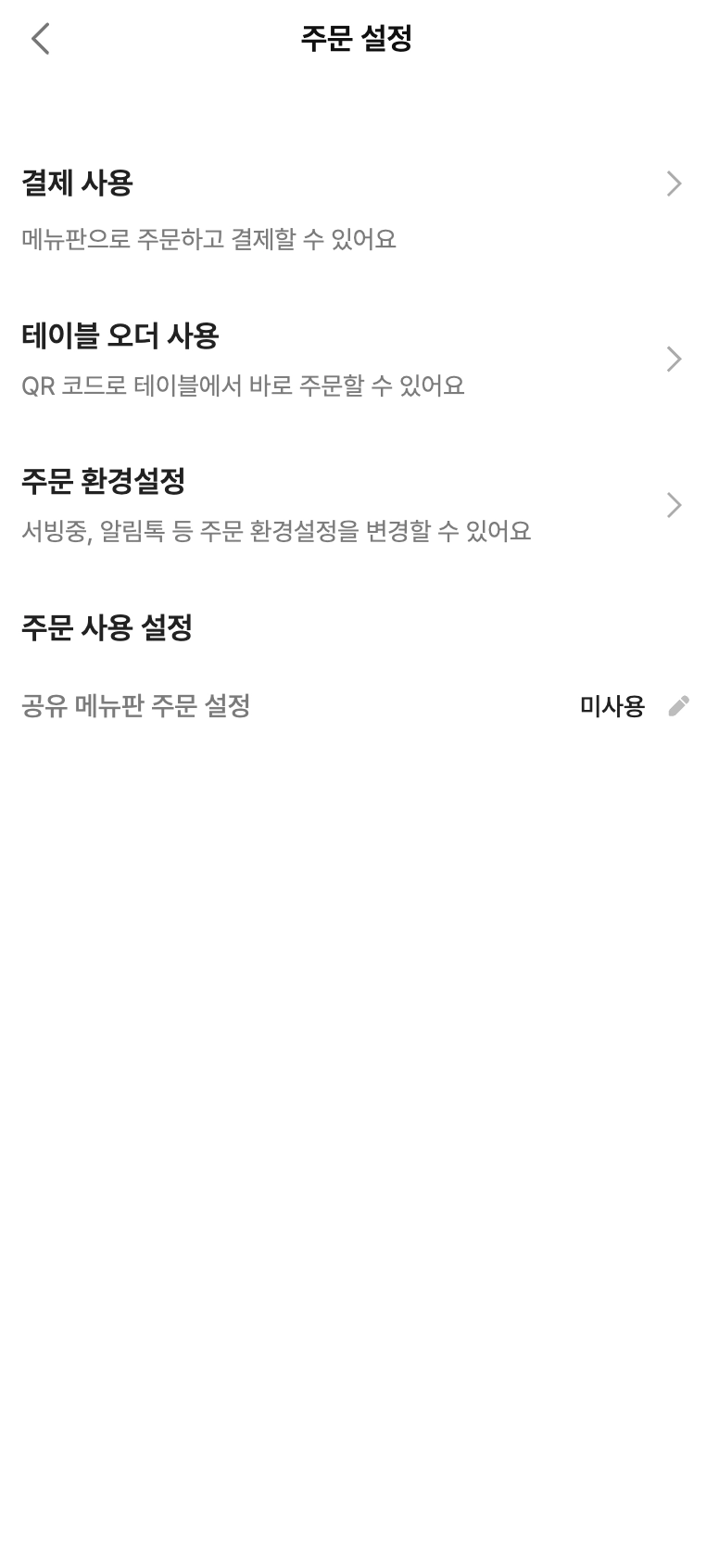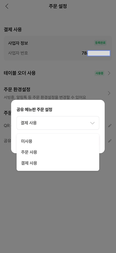 하단 주문 사용 설정에서 QR 메뉴판, 공유 메뉴판에서 결제를 사용할지 여부를 선택할 수 있습니다.