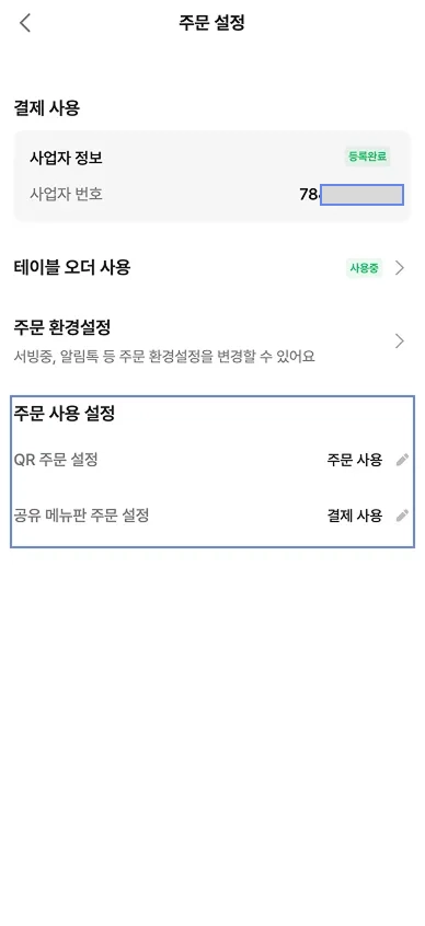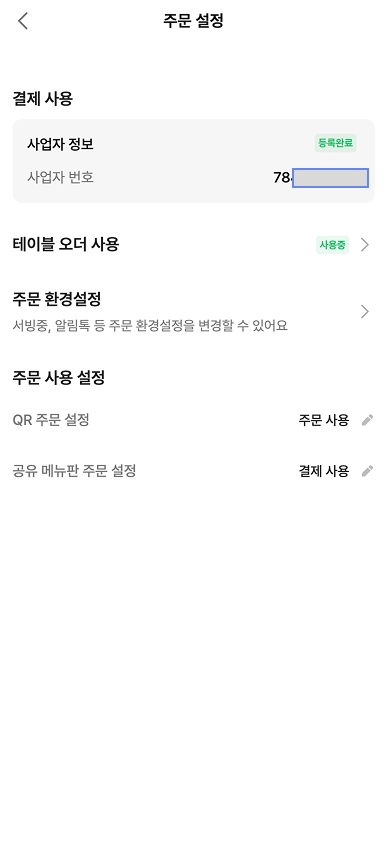 사업자 번호 등록이 완료 되면 [주문 설정]에서 사업자 번호와 등록완료를 확인할 수 있습니다.