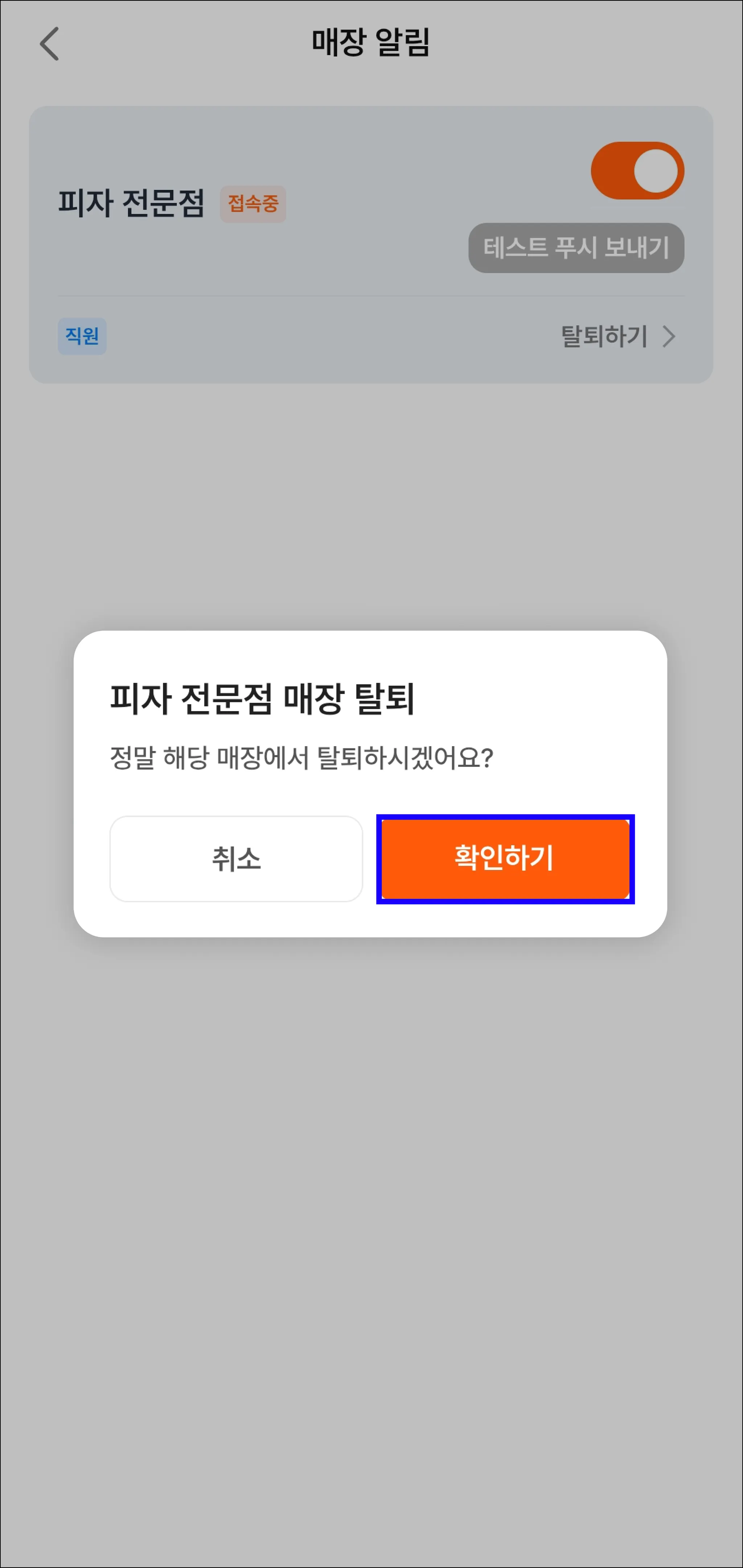 [확인하기] 버튼을 누르면 매장에서 탈퇴돼요.