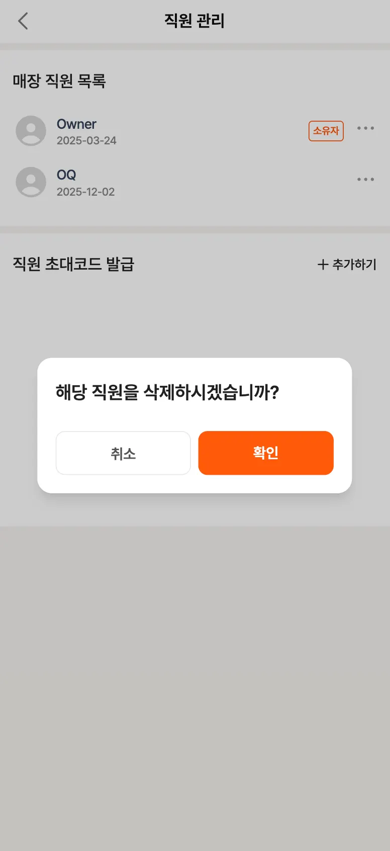 팝업 창에서 [확인]을 누르면 직원이 매장에서 탈퇴됩니다.